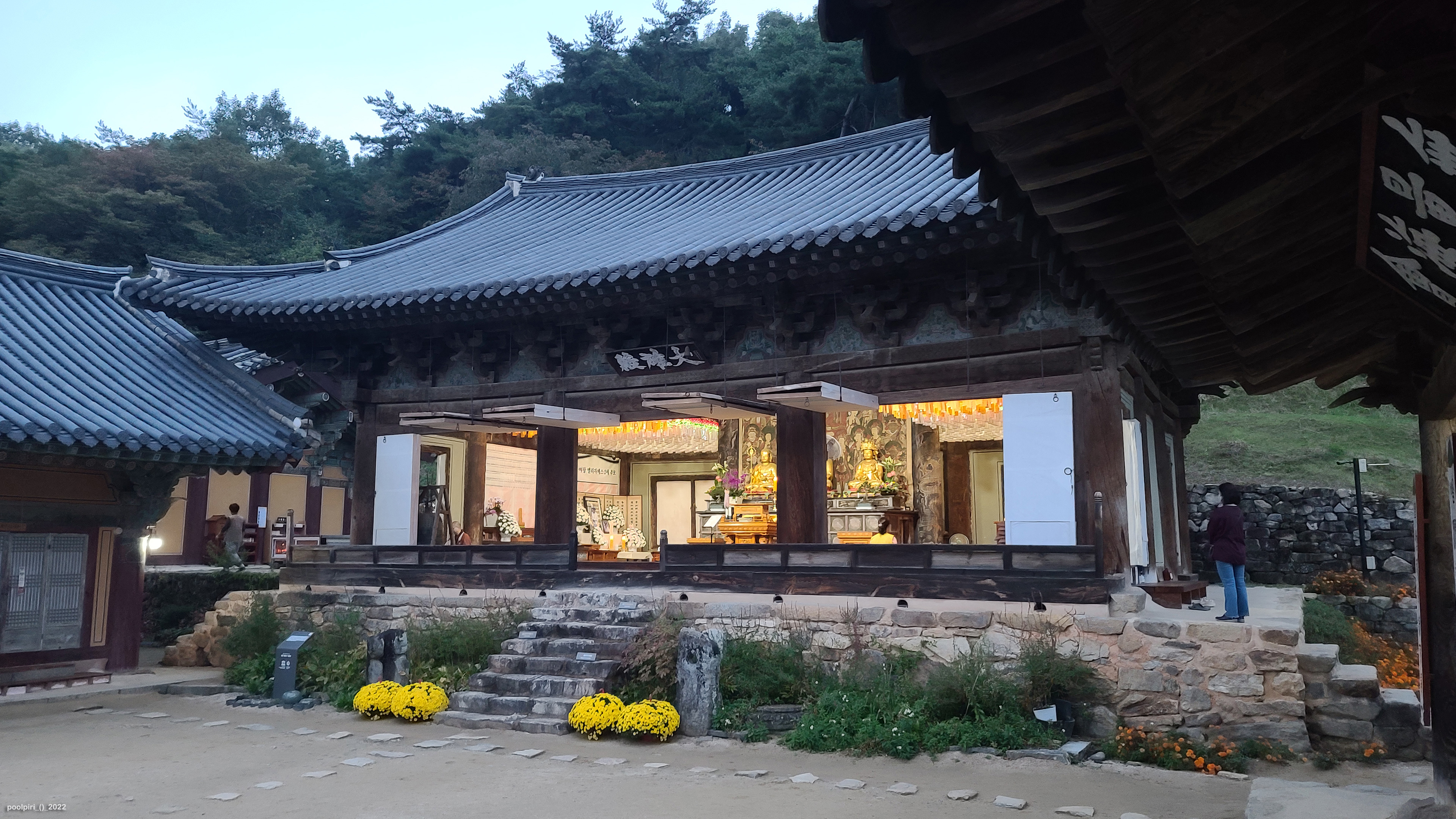 인접한 폐쇄형 극락전과 달리 대웅전은 문을 활짝 열어놓았다. 대웅전 쪽마루 난간은 자연스레 발길을 끌어들인다.