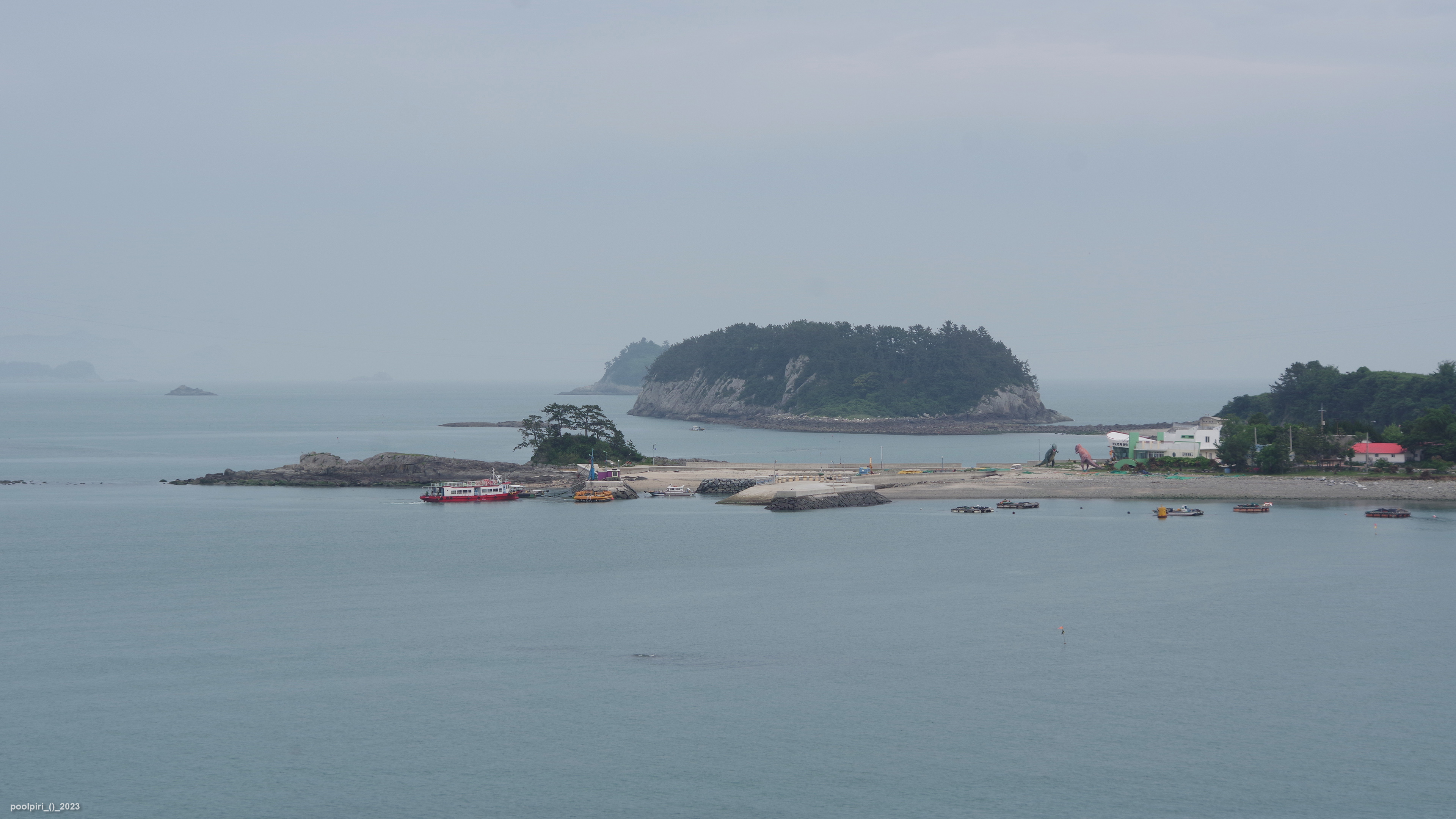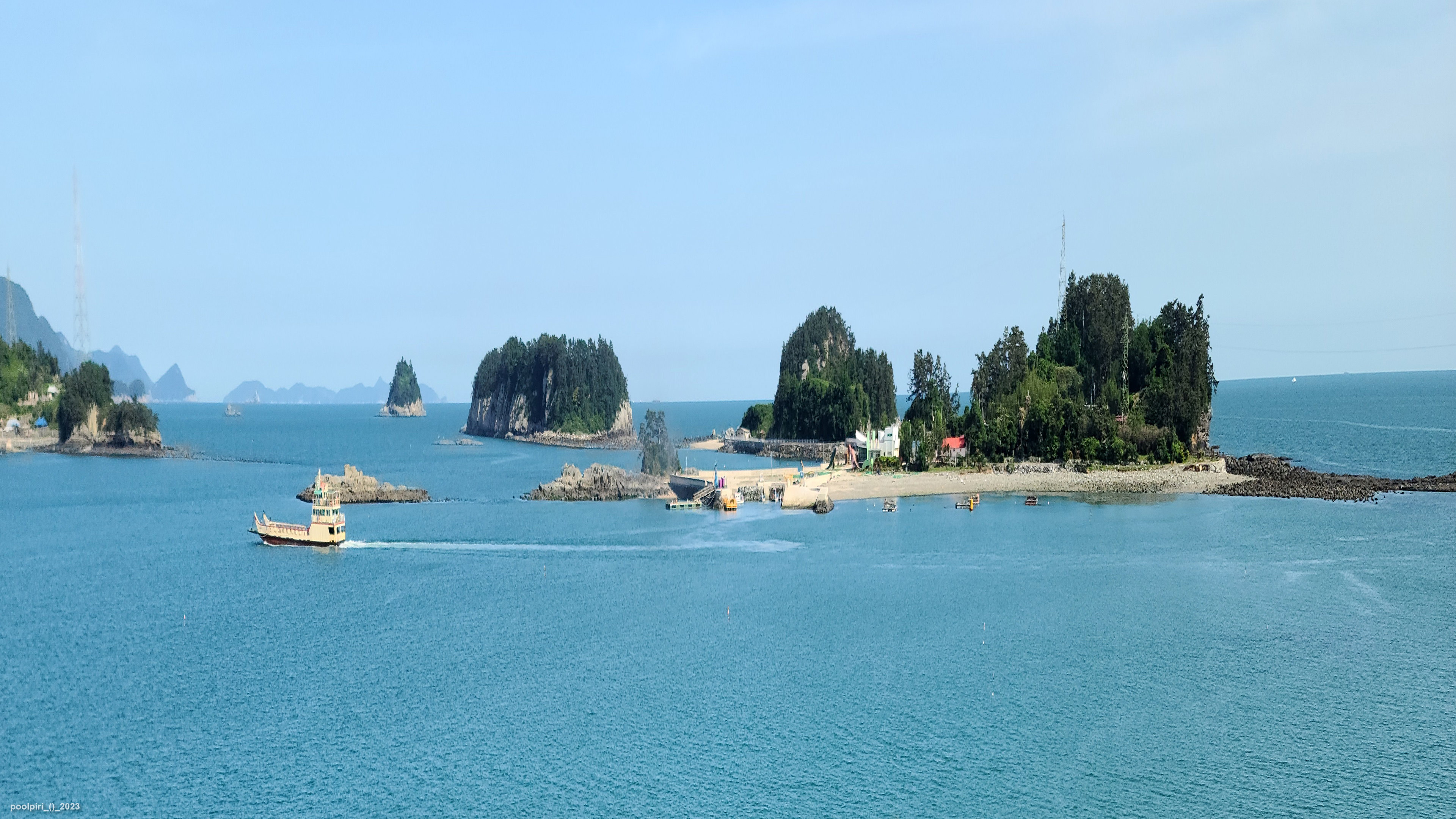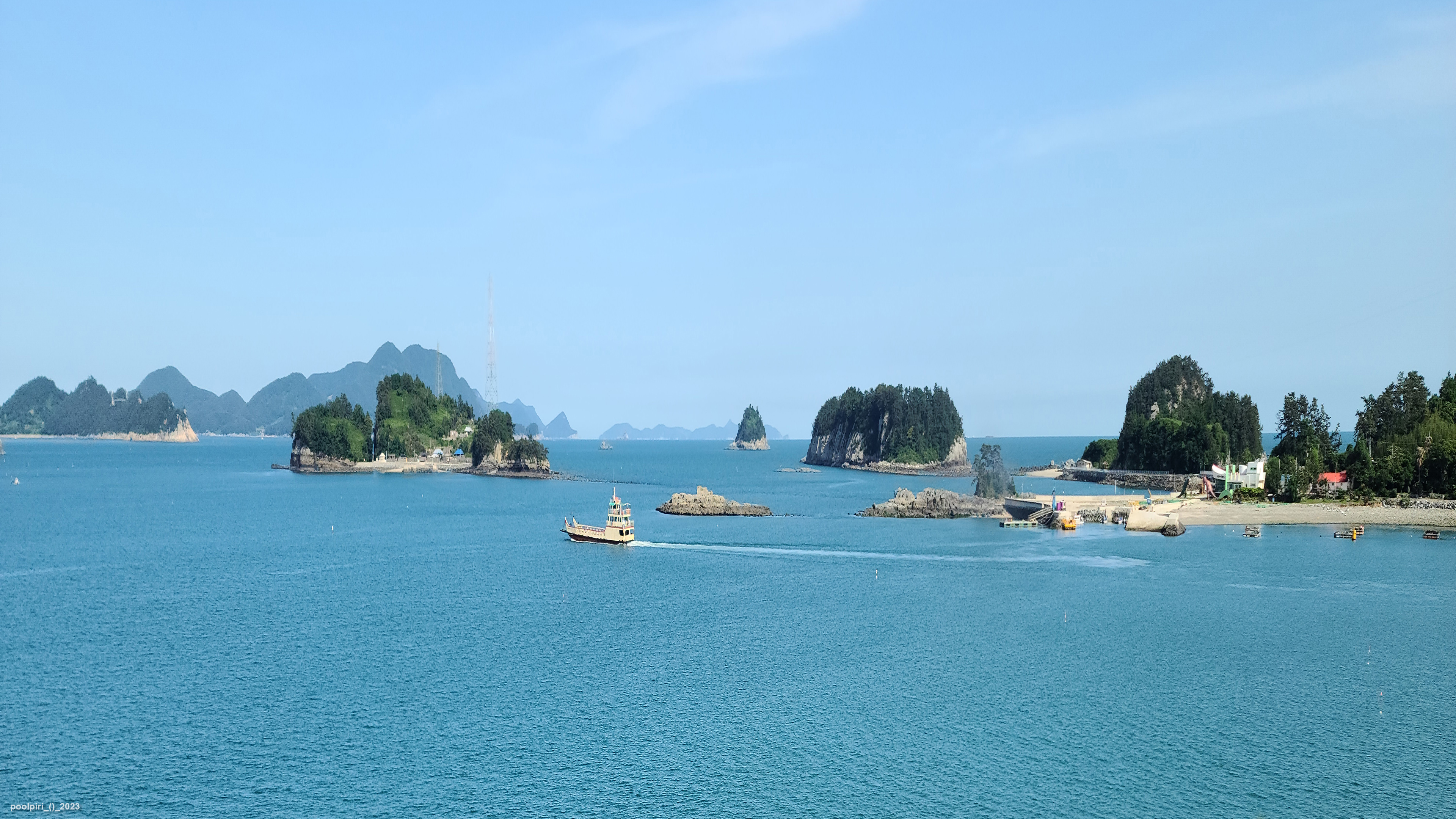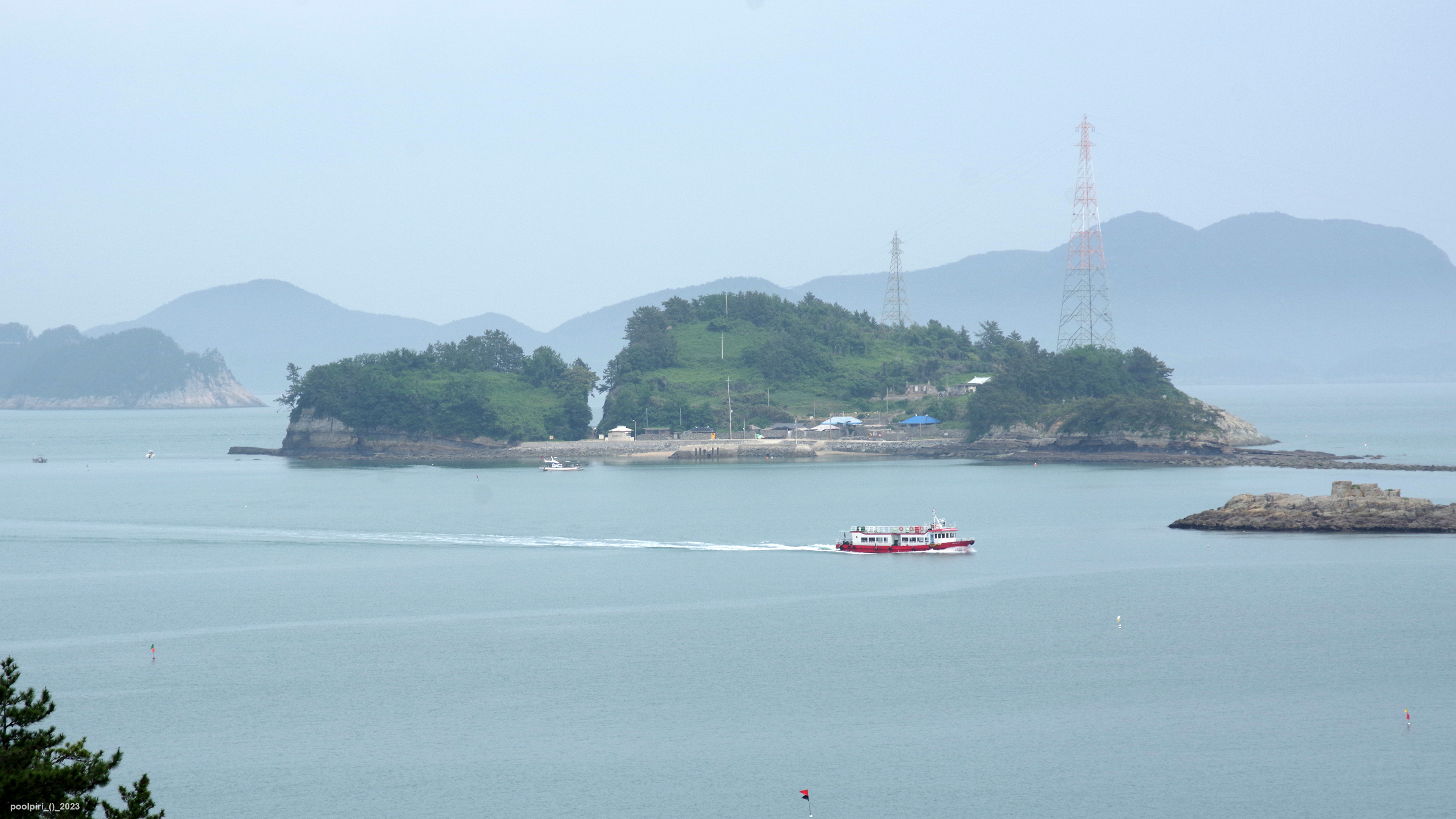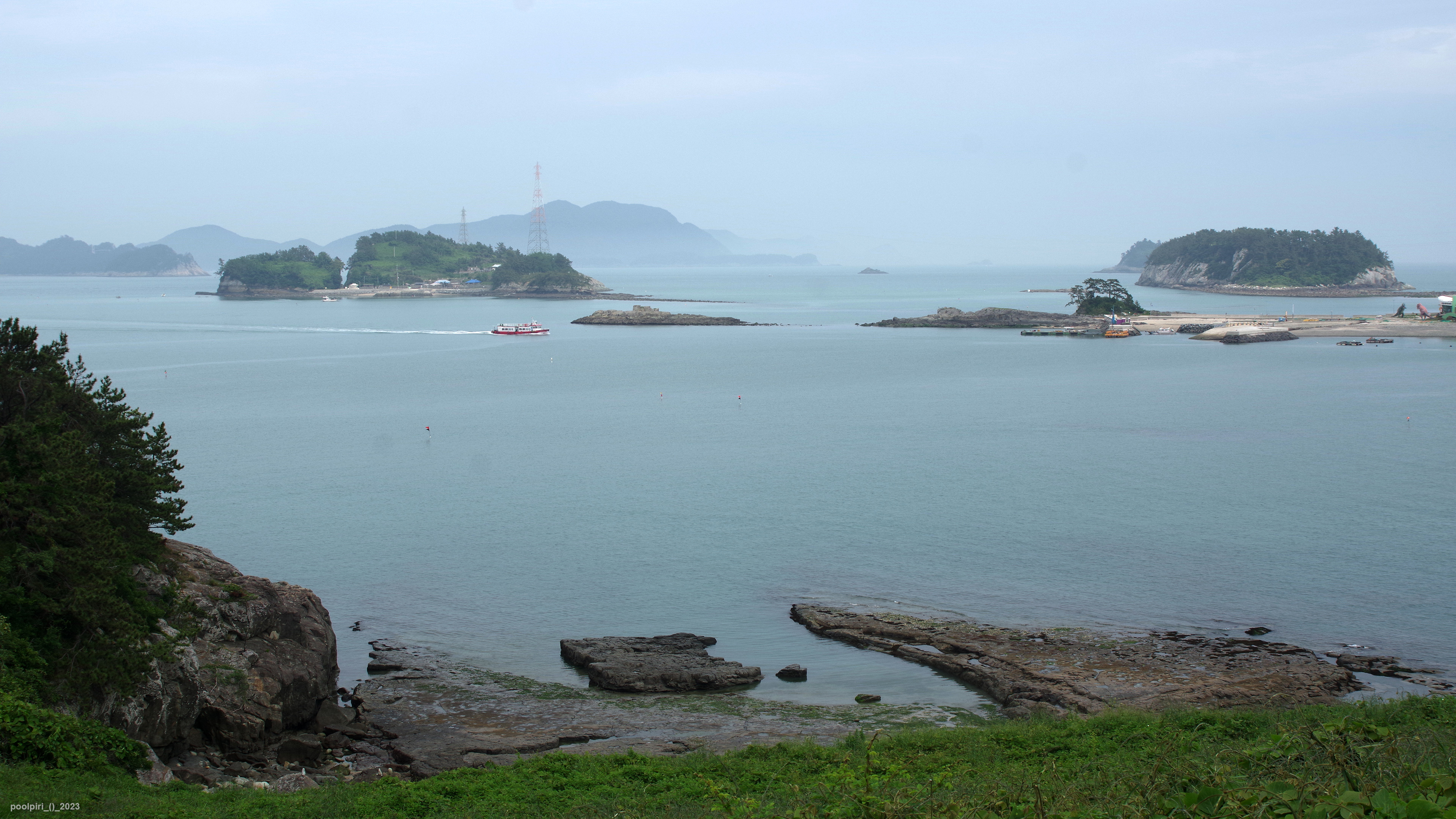 낭도에서 바라본 사도(沙島, 모래섬) 쪽 조망이 멋지다. 백야도와 (제도-개도-하화-상화-사도를 거쳐) 낭도를 오가는 대형카훼리 3호(태평양해운)가 낭도항에 닿는다.