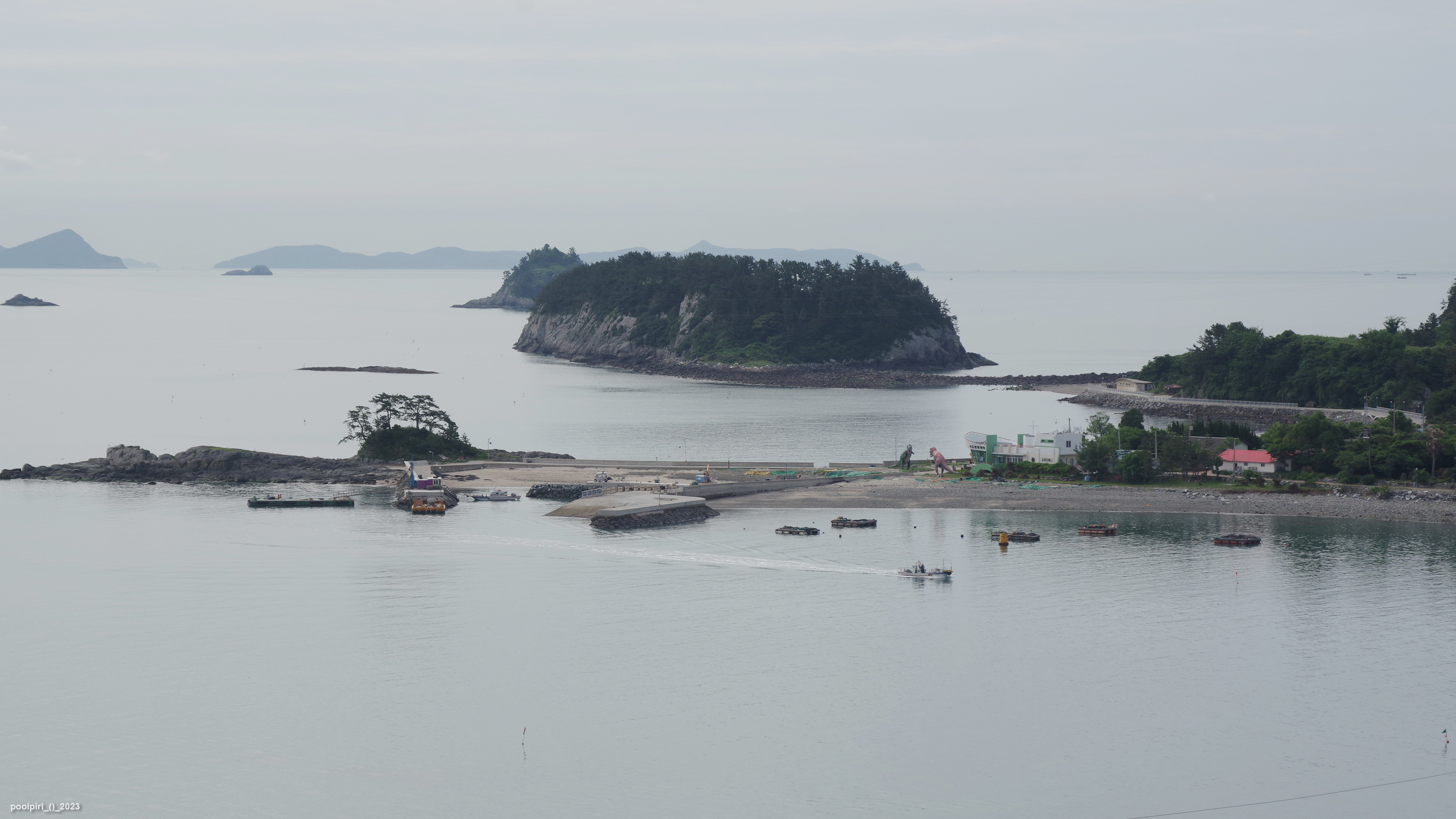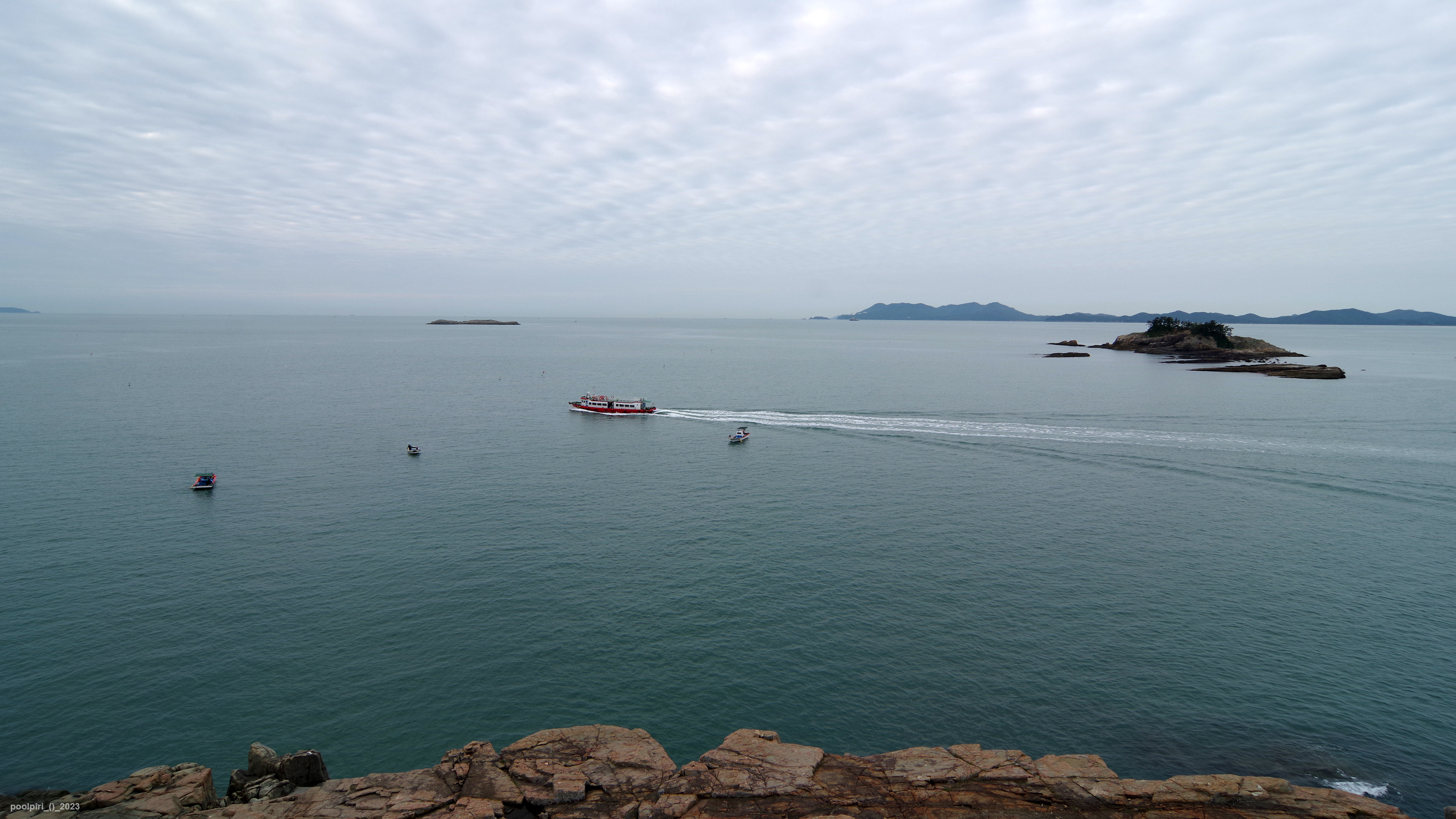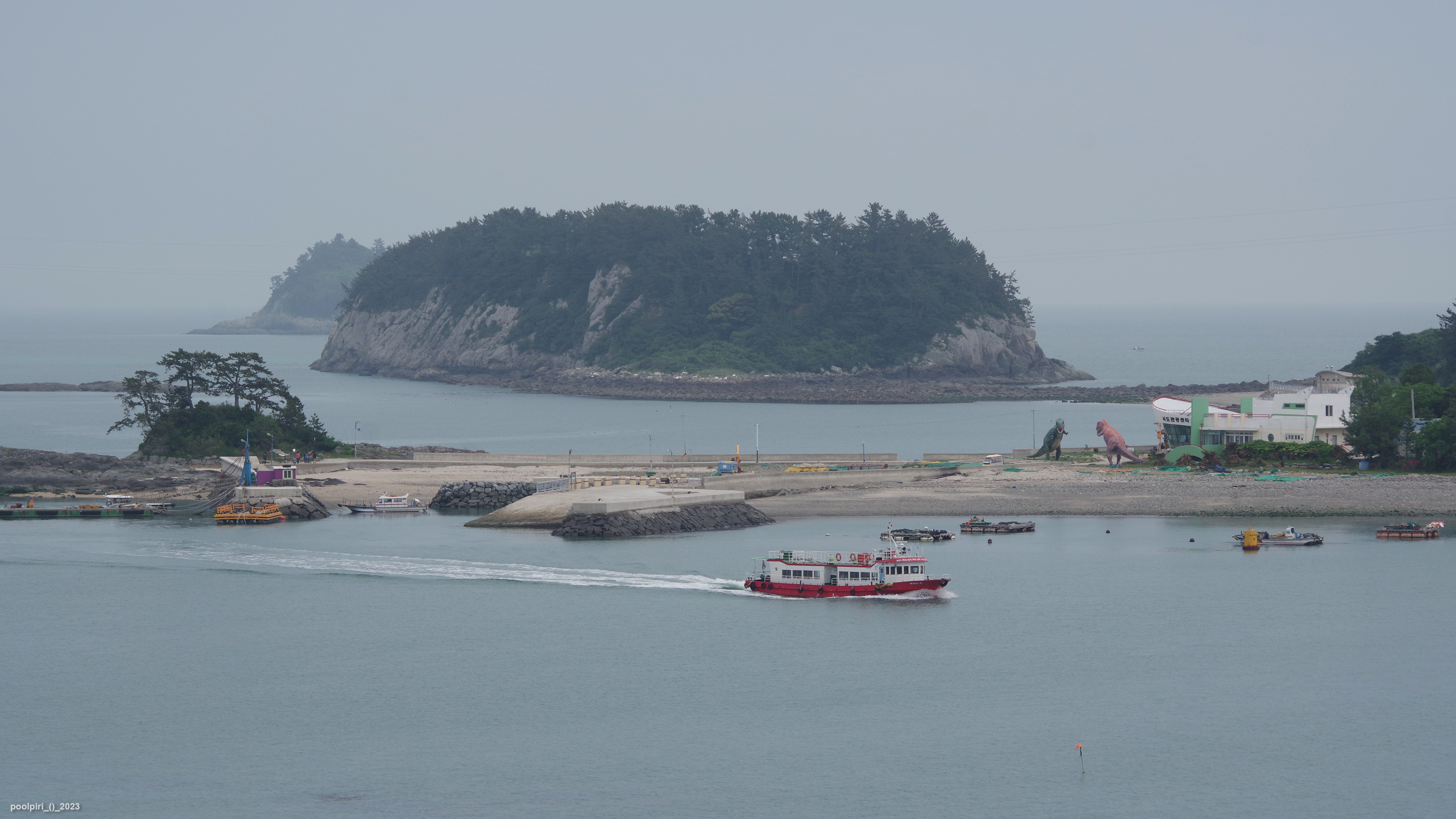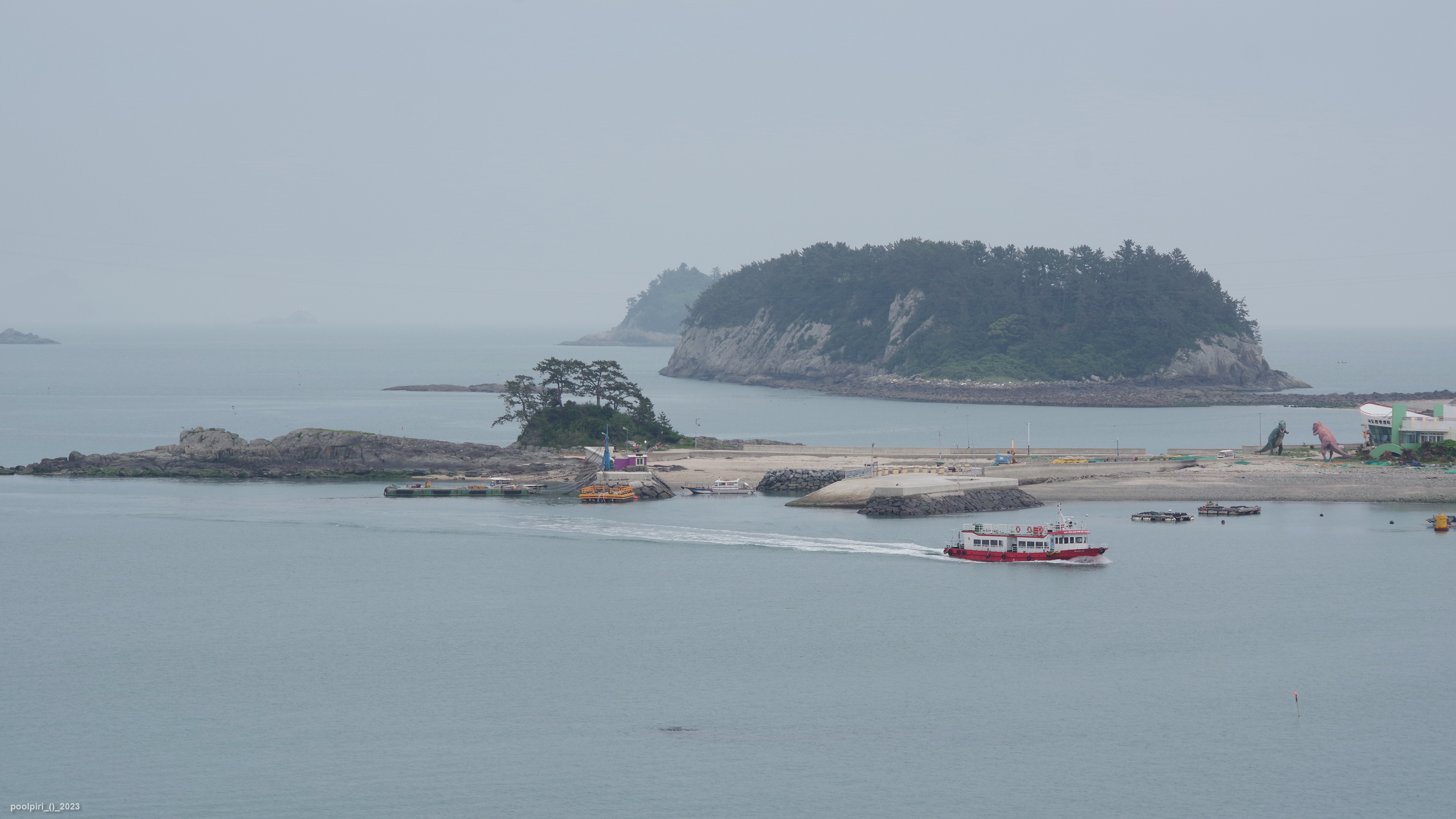 낭도에서 바라본 사도(沙島, 모래섬) 쪽 조망이 멋지다. 백야도와 (제도-개도-하화-상화-사도를 거쳐) 낭도를 오가는 대형카훼리 3호(태평양해운)가 낭도항에 닿는다.